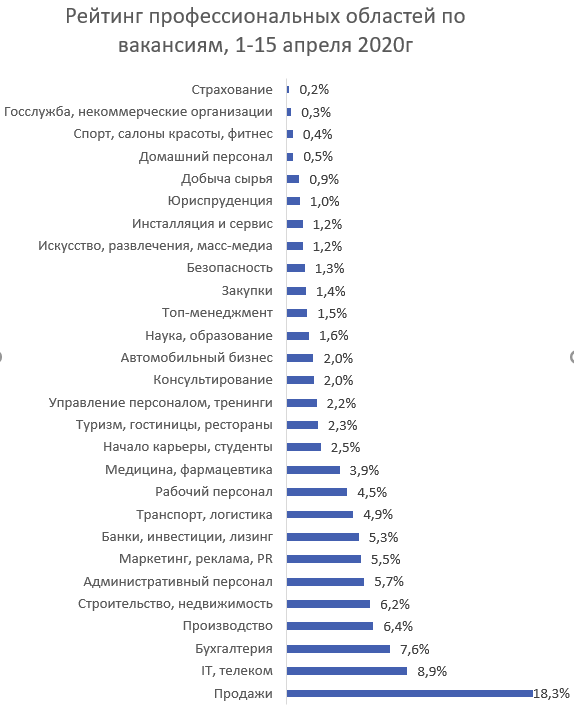 Так, наименее востребованными профобластями по состоянию на 17 апреля 2020 года среди работодателей являются: страхование; государственная служба, некоммерческие организации; спортивные клубы, фитнес, салоны красоты; домашний персонал; добыча сырья.