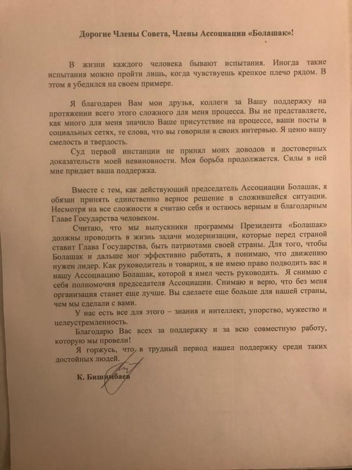 Жумин рассказал, что Бишимбаев отправил личное сообщение в адрес ассоциации. В послании, текст которого также опубликован, осужденный экс-министр благодарит членов организации "за поддержку в его нелегком испытании и совместную работу".