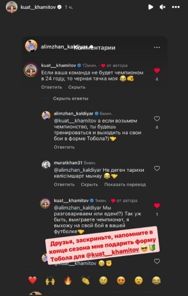 Хамитов обратился к Калдиярову в Instagram: "Если ваша команда не будет чемпионом в 2024 году, то черная тачка моя", на что руководитель костанайского клуба ответил: "А если возьмем чемпионство, ты будешь тренироваться и выходить на свои бои в форме "Тобола"?". "Так уж и быть, выиграете чемпионат — я выхожу на свой бой в вашей футболке", — "оформил" спор Хамитов.