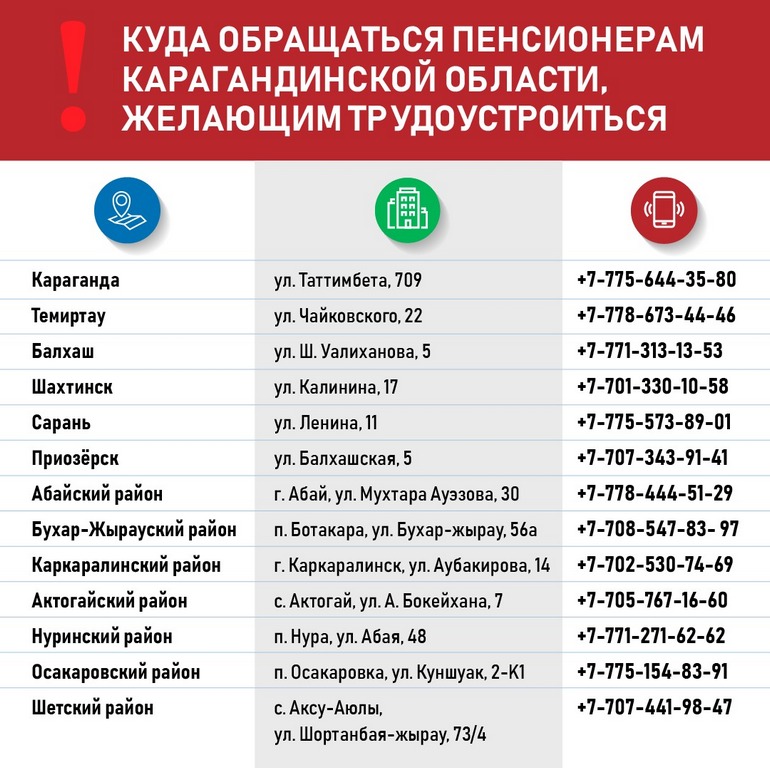 Реализация программы будет осуществляться через Центр трудовой мобильности по Карагандинской области (Call-центр – 60-50-50, 8-775-644-35-80), а также карьерные центры городов и районов региона.