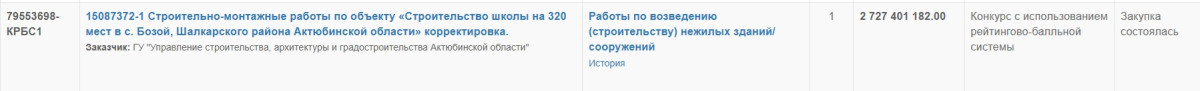 Самая дорогая закупка июля – строительство школы на 320 мест в селе Бозой Шалкарского района Актюбинской области. Контракт на 2 727 401 182 тенге заключило областное управление строительства.