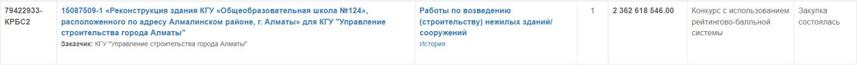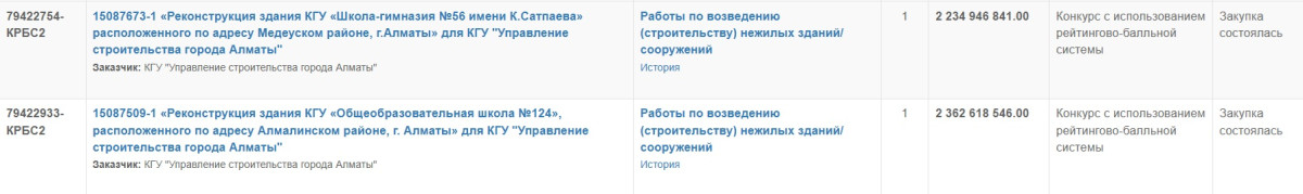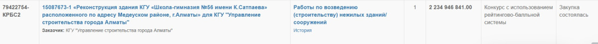 Алматинский бюджет в июле отличился сразу двумя крупными тендерами. Оба на реконструкцию школ. Здание школы №124 в Алмалинском районе обойдётся в 2 362 618 546 тенге, а школа-гимназия имени Сатпаева – в 2 234 946 841 тенге. Общая сумма – почти 4,6 млрд тенге на реконструкцию двух объектов.