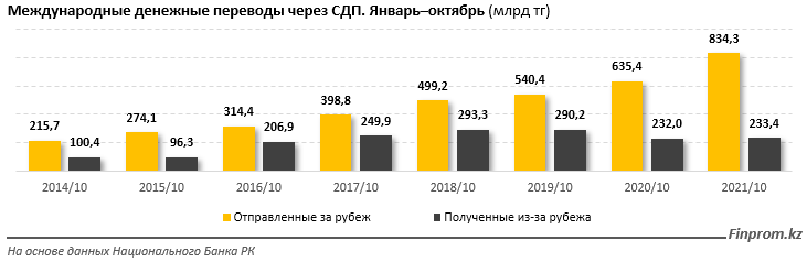 Объем средств, отправленных за границу через международные системы денежных переводов, за январь–октябрь 2021 года составил 834,3 миллиарда тенге) — на 31,3% больше по сравнению с аналогичным периодом прошлого года.