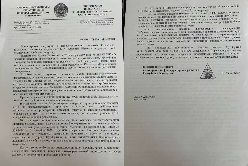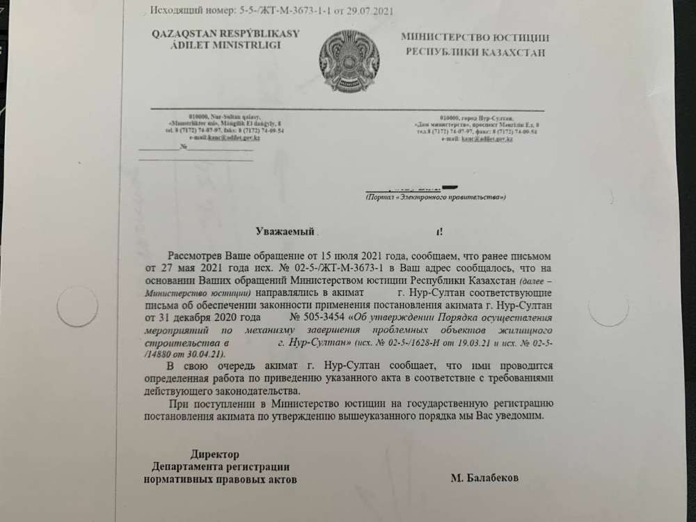 "Аким в своем постановлении решил, что я получаю квартиру на основании решения суда. То есть он меня обязывает принести для ЕКК постановление суда. Мы в МИИР РК писали письмо об этом постановлении, что оно грубейшим образом противоречит действующему законодательству. В МИИР это признали и рекомендовали акимату пересмотреть этот пункт, также как и пункт с ЖСК. В свою очередь акимат Нур-Султана сообщает, что ими ведется определенная работа по приведению указанного акта в соответствии с требованием законодательства. Министерство и сам акимат в ответе министерству подтверждают факт, что с этим постановлением что-то не так. Но никто ничего с этим не делает", - сказал Данияр Абенов.