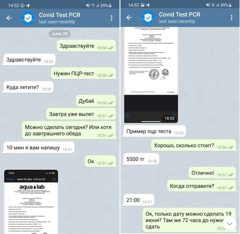 "ПЦР-тесты на COVID. В любую страну из Казахстана. ПЦР-тест на двух языках: русский, английский. Самая низкая цена в Казахстане. Сроки получения до 2-х часов. Пишите в ЛС!‼️"Мы "клюнули" на обещание быстрого результата. На наше сообщение пользователь с ником "Covid Test PCR" ответил сразу. Для убедительности корреспондент BaigeNews.kz придумала легенду, что срочно летит в Дубай (ну куда же еще?), и сдавать анализы на COVID-19 ей просто некогда. Это потом выяснилось, что для изготовителя совершенно неважны мотивы, заставившие тебя нарушить закон. Главное, ты платишь деньги, а значит, и заказываешь музыку. В нашему случае - ПЦР-справку.