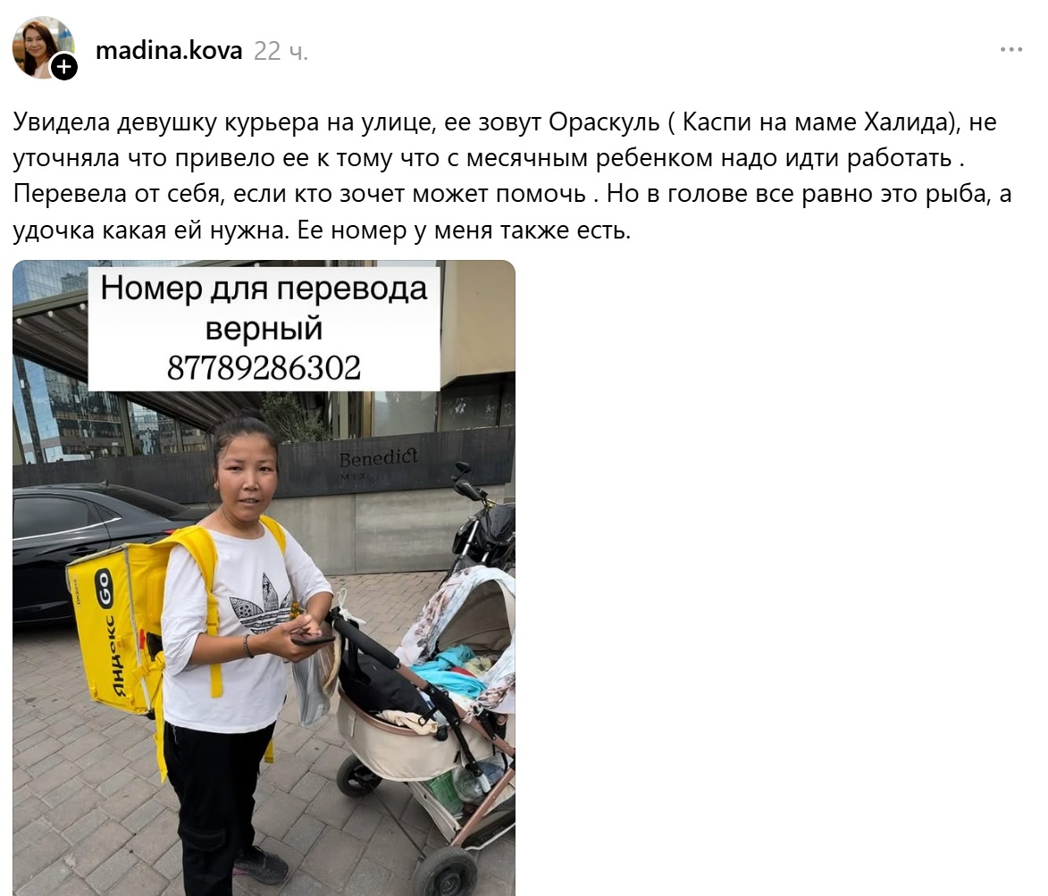 Пользовательница Threads с ником madina.kova поделилась постом, который вызвал бурную реакцию в казахстанском сегменте соцсетей. По её словам, она увидела на улице молодую курьершу с грудным ребёнком на руках, передаёт BAQ.KZ.