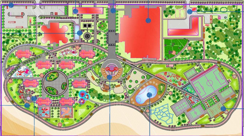 Территория лагеря будет разделена на несколько зон. В административной расположатся общежития для персонала, административное здание, медицинский пункт. В здании расположатся детский центр, кинозал, тренажерный зал, библиотека и различные кружки для детского творчества. Рядом дети смогут заниматься на станции юных натуралистов.