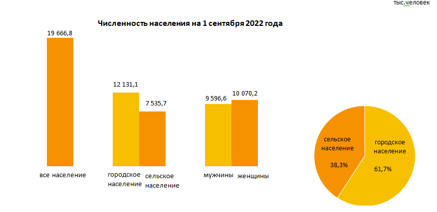 - 12 131,1 тысячи и 7 535,7 тысячи — количество городского и сельского населения в стране. Это 61,7 процента и 38,3 процента казахстанцев соответственно;