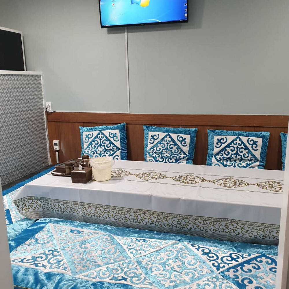 - Оно рассчитано на 60 человек. Есть танцплощадка. Предусмотрен специальный топчан, где можно на корпешках сидеть. Специально из Шымкента мне привезли корпешки и подушки с казахским орнаментом. Вот у меня дастархан, для тех, кто хочет сидеть или лежа есть.