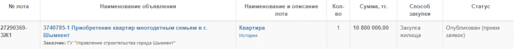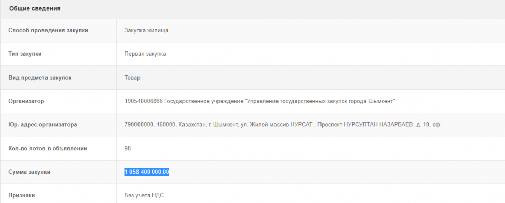 Объявление о приобретении жилья размещено на сайте госзакупок. На каждую квартиру предусмотрены 10 800 000 тенге. В общей сложности они обойдутся в 1 058 400 000 тенге.