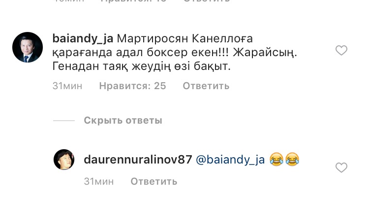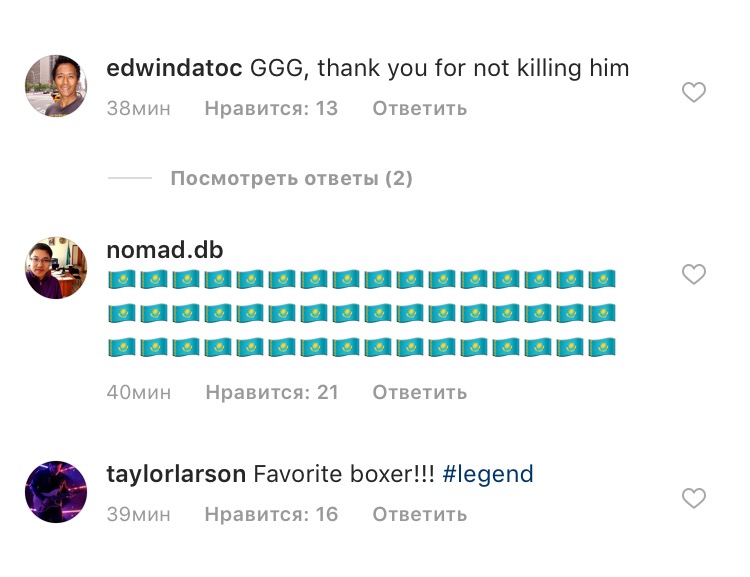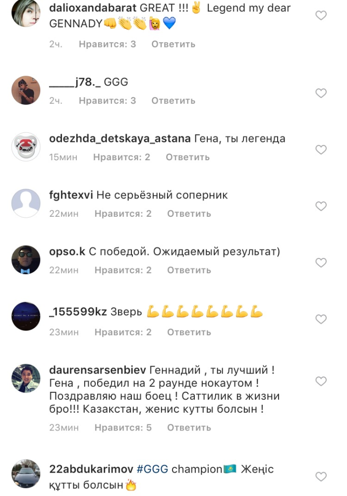 Также, зарубежные фанаты отмечают, что Геннадий Головкин "очень скромный боксёр, поэтому все фанаты его любят". Между тем, казахстанцы посвятили свои песни, стихи к бою GGG, поздравляя нашего спортсмена. Позже Геннадий Головкин в своем Instagram выложил фотографию со своим сегодняшним соперником Ванесом Мартиросяном.