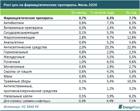 В то же время, несмотря на рост как производства, так и импорта, "коронавирусный" ажиотаж привел к заметному росту цен. Так, за июль фармацевтические препараты в РК подорожали сразу на 0,7 процента, при средней инфляции по стране на уровне 0,3 процента. С начала года рост цен составил 6,3 процентов (при инфляции в 4,4 процента), а в сравнении с июлем 2019 года — 7,7 процентов (при годовой инфляции в 7,1 процента). Сильнее всего за месяц подорожали жаропонижающие (на 2,8 процента) и антисептики (на два процента).