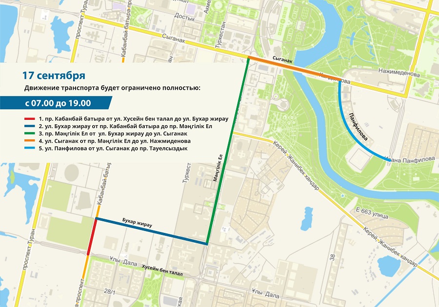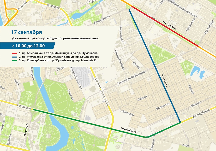 В связи с этим на участке улицы Рыскулова от ул.Сауран до пр.Мәңгілік Ел до окончания мероприятия движение транспорта будет ограничено полностью.