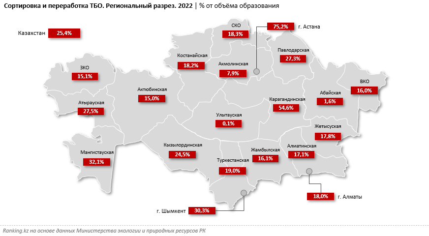 Доля сортировки и переработки твёрдых бытовых отходов в Казахстане в 2022 году составила 25,4 процента, увеличившись за год всего на два процентных пункта. В стране есть регионы, где на переработку попадает всего один процент отходов, передаёт BaigeNews.kz со ссылкой на данные аналитиков Ranking.kz.