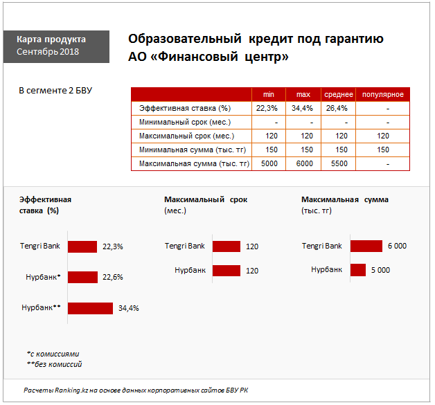 Согласно данным с сайта АО «Финансовый центр», студенческие образовательные кредиты под гарантию государства предлагают 4 БВУ - Сбербанк, ForteBank, Tengri Bank и Нурбанк. При этом там же говорится, что Сбербанк временно приостановил данный вид кредитования, также отсутствует информация о кредитах студентам и на сайте Сбербанка. У ForteBank на корпоративном сайте также нет информации по продукту. Информация по этому виду кредитования есть только на сайтах Нурбанка и Tengri Bank.