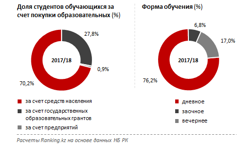Отмечается, что у большинства студентов форма обучения дневная - 76,2% или 378,2 тысяч человек. Заочно обучаются 17% или 84,4 тысяч человек. На вечерней форме обучения занимаются лишь 6,8% или 33,6 тысяч человек.