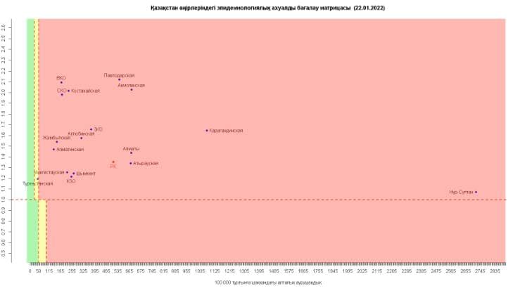 Опубликована матрица оценки эпидемиологической ситуации в регионах Казахстана на 22 января 2022 года, передает BaigeNews.kz со ссылкой на coronavirus2020.kz.