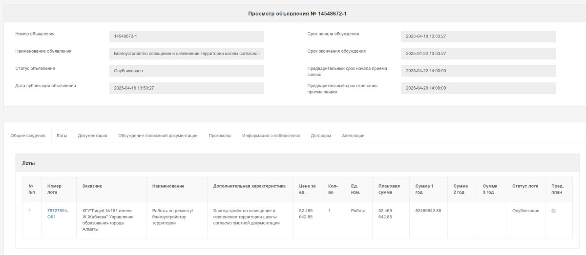 На портале государственных закупок появился интересный лот. КГУ "Лицей №161 имени Жамбыла Жабаева" Управления образования города Алматы планирует потратить 52,5 миллиона тенге на благоустройство и озеленение своей территории, передаёт BaigeNews.kz.