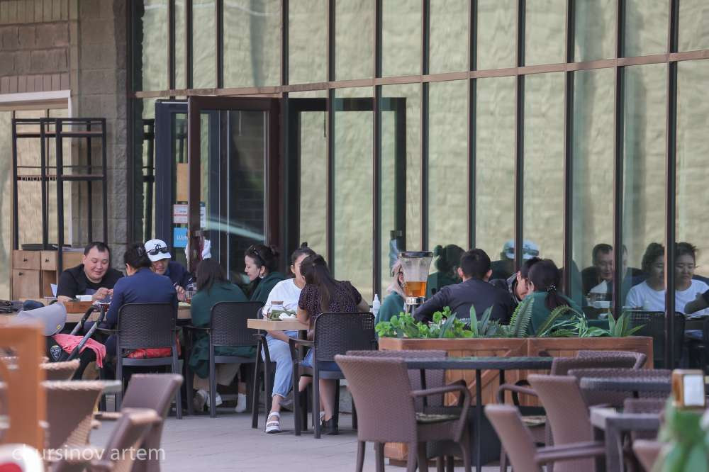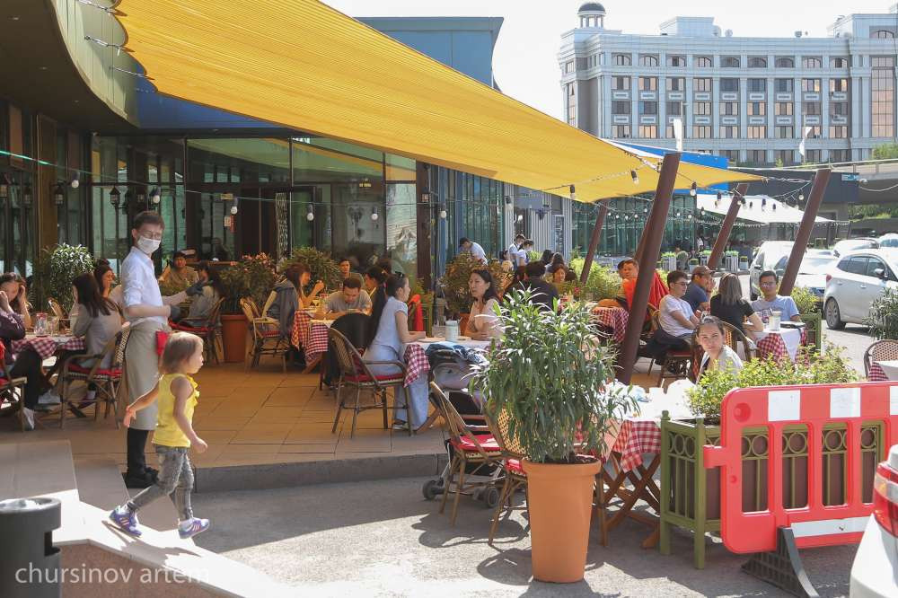 В столице открыты кафе и рестораны. Люди трапезничают на летниках, которым разрешено работать во время карантина.
