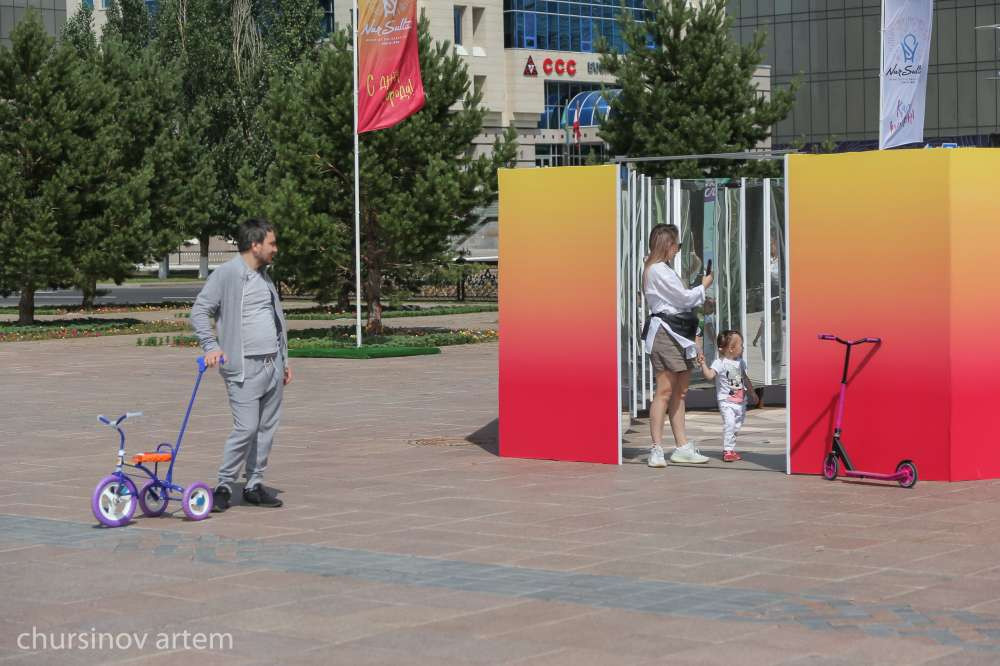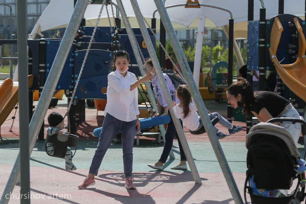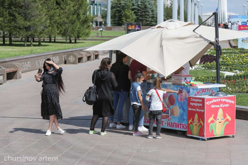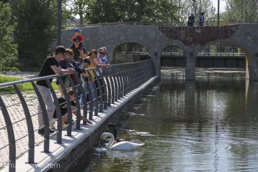 В это время в центральном парке Нур-Султана дети купаются в фонтанах. Взрослые отдыхают на набережной, кормя местных лебедей. Другие наслаждаются природой.