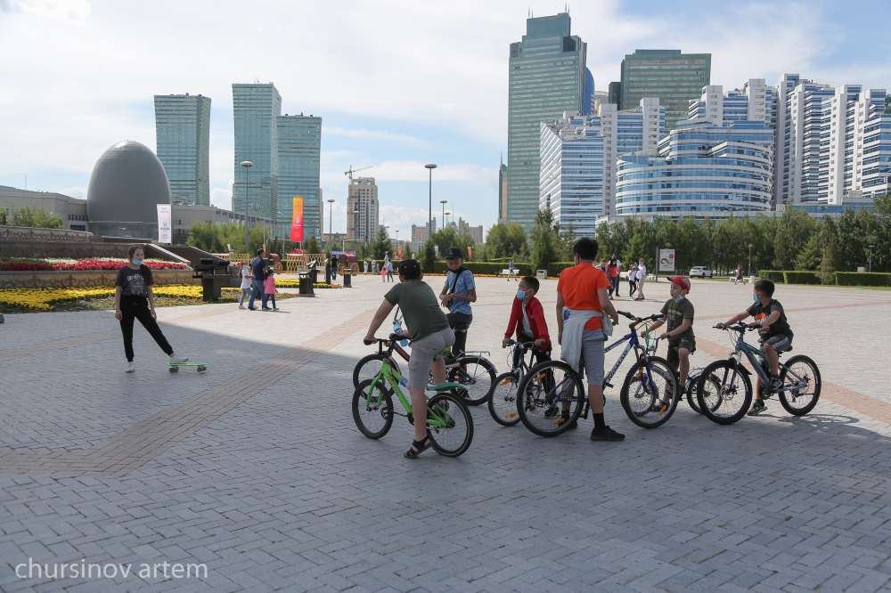 Большое количество людей собрано возле монумента Байтерек. Дети катаются на велосипедах, при этом у всех есть маски.
