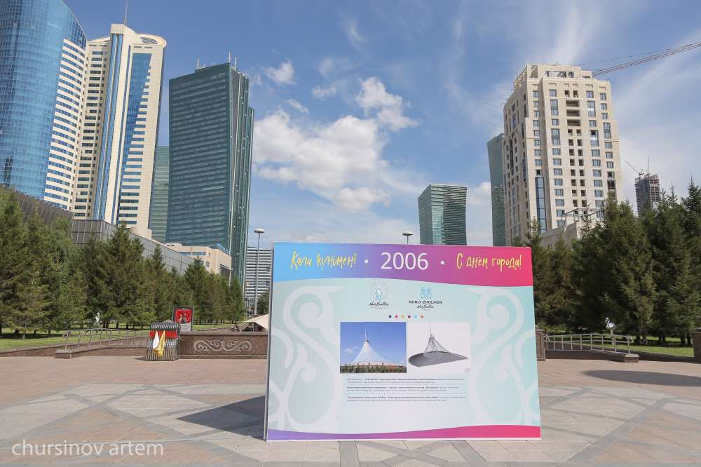 В честь Дня города вдоль водно-зеленого бульвара расположены инсталляции. На них изображены исторические события, которые прошли в Нур-Султане со дня независимости.