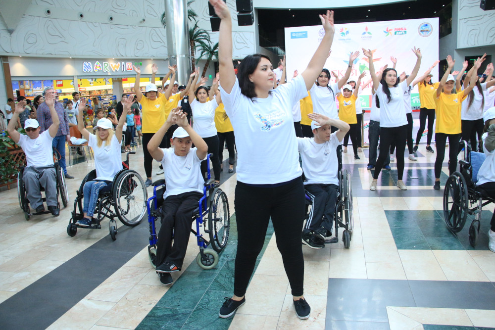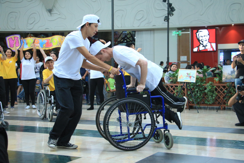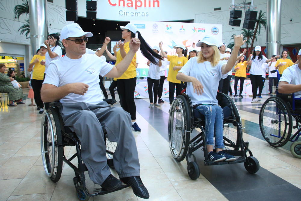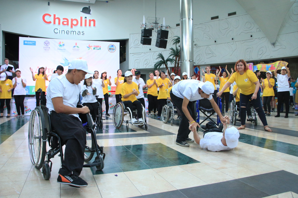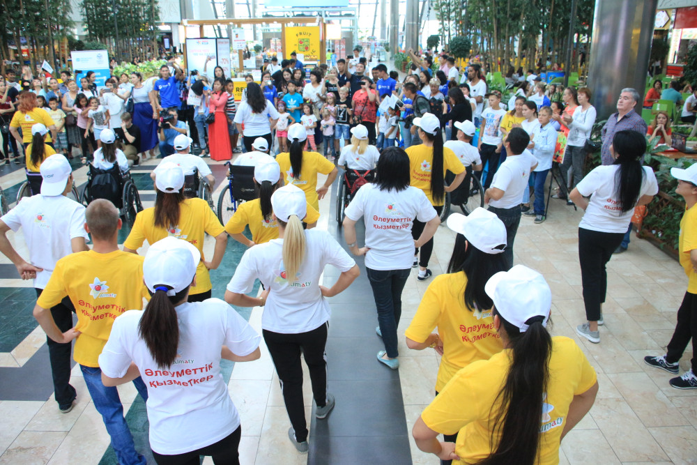 Флешмоб состоялся в торгово-развлекательном центре «MEGA Park». 50 социальных работников и 20 лиц с ограниченными возможностями, а это инвалиды с нарушениями опорно-двигательного аппарата и с ментальными нарушениями, исполняли зажигательные уличные танцы.