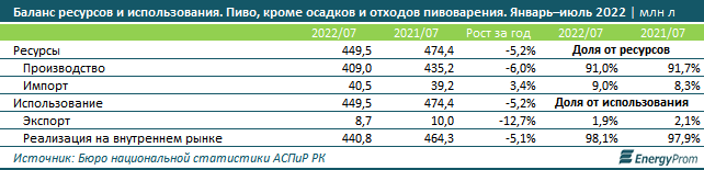 Экспорт пива из РК сократился на 12,7 процента и составил 8,7 миллиона литров за январь–июль 2022 года. Объём реализации на внутреннем рынке сократился на 5,1 процента, до 440,8 миллиона литров.