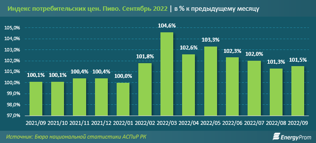 По итогам сентября 2022 года пиво подорожало на 1,5 процента за месяц, что является одним из самых высоких месячных показателей роста цен. В целом текущий год отличился подобными негативными скачками: так, в марте зафиксировано рекордное месячное удорожание пива — на 4,6 процента, также резкий рост цен отмечался в мае (на 3,3 процента), апреле (на 2,6 процента) и июне (на 2,3 процента).