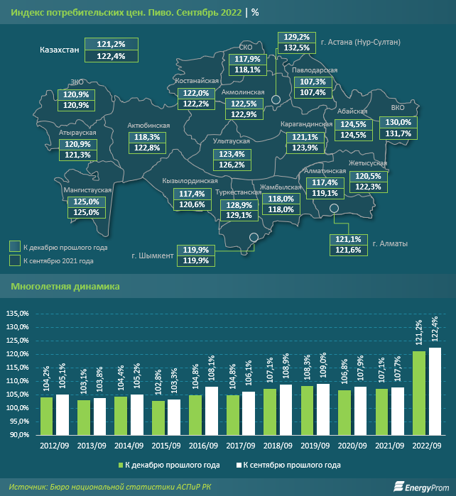 В региональном разрезе с начала года цены на пиво выросли заметнее всего в Восточно-Казахстанской области (на 30 процентов), Астане (на 29,2 процента) и Туркестанской области (на 28,9 процента). По сравнению с сентябрём прошлого года самый заметный рост цен также пришёлся на Астану (плюс 32,5 процента), Восточно-Казахстанскую (плюс 31,7 процента) и Туркестанскую (плюс 29,1 процента) области.