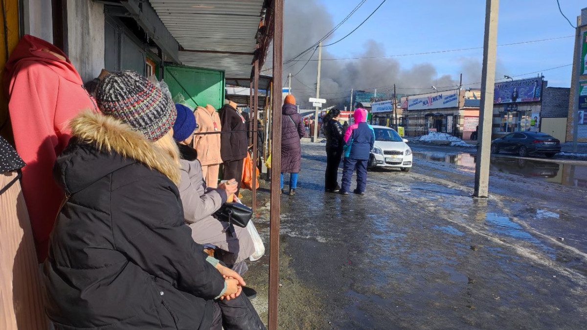 Здесь был организован пункт приёма заявлений от потерпевших в пожаре. Причины возгорания сейчас устанавливается.