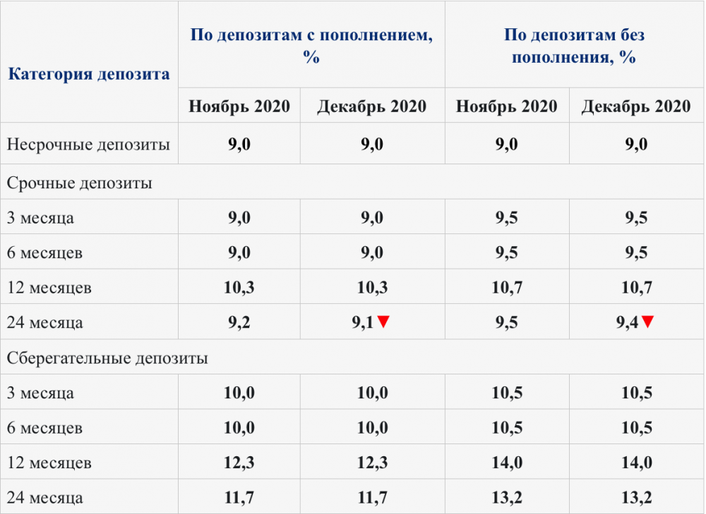 "Ставка по срочным депозитам на 24 месяца продолжает тенденцию плавного снижения в результате сокращения фактических рыночных ставок банков. Максимальные рекомендуемые ставки по данной категории депозитов с правом пополнения составят 9,1 процента, а без права пополнения – 9,4 процента. Очередное снижение отражает низкую заинтересованность банков в данных видах вкладов, которые по своим условиям для вкладчиков не имеют выраженного различия со срочными вкладами на другие сроки", – говорится в сообщении.