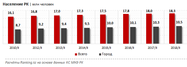 По официальным данным, за год количество очередников на льготное жилье по различным госпрограммам выросло с 2,5 до 2,8 млн (с 2016 по 2017гг). Очевидно, что в среднесрочной перспективе (два-три года) эта аудитория будет увеличиваться быстрыми темпами. Причина — высокий демографический рост и активная урбанизация. Со второго квартала 2017-го по второй квартал 2018-го население Казахстана в целом увеличилось на 238 тыс. человек. Горожан стало больше на 190 тыс.