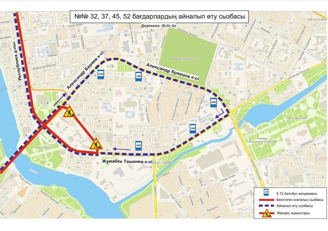 "До завершения ремонтных работ, временно изменены схемы движения маршрутов №№ 32, 37, 45, 52. Просим заранее планировать свой маршрут", - сообщили в ТОО "City Transportation Systems".