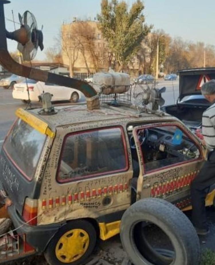 На изображении видно, что на крыше установлена дымоотводная труба и другие механизмы. А сзади разместилась корзина для дров. При этом кузов автомобиля исписан разными именами, номерами и разными фразами. Судя по госномеру машины(H244UAM), она из Жамбылской области.