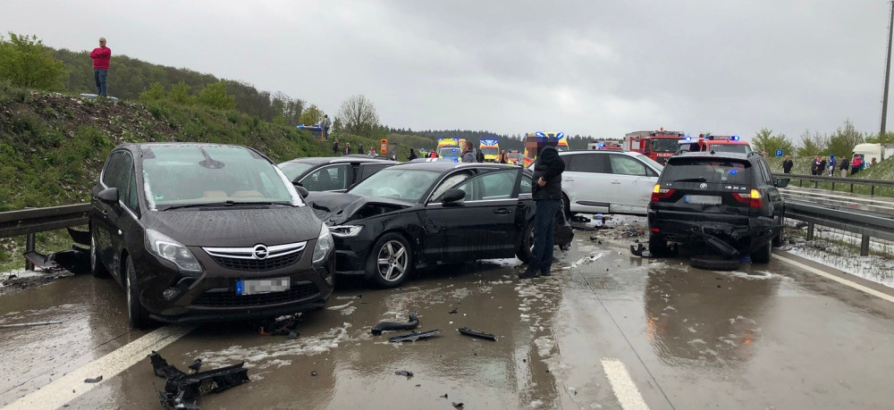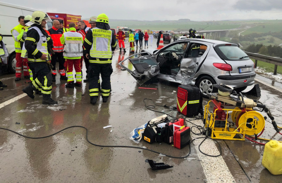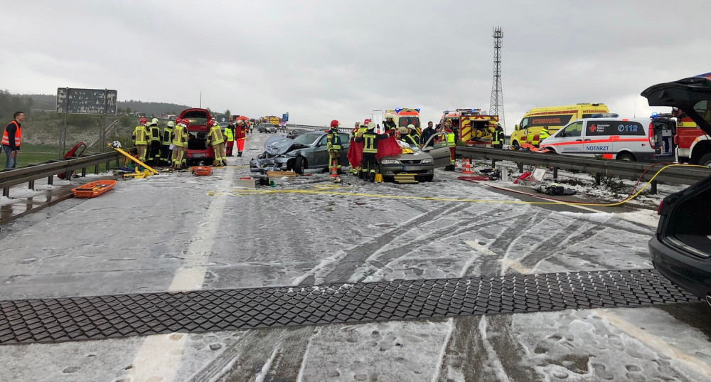 Авария произошла из-за гололедицы и внезапного града на автобане 71 в федеральной земле Тюрингии на участке между городами Зуль и Майнинген. Четверо получили тяжелые травмы.