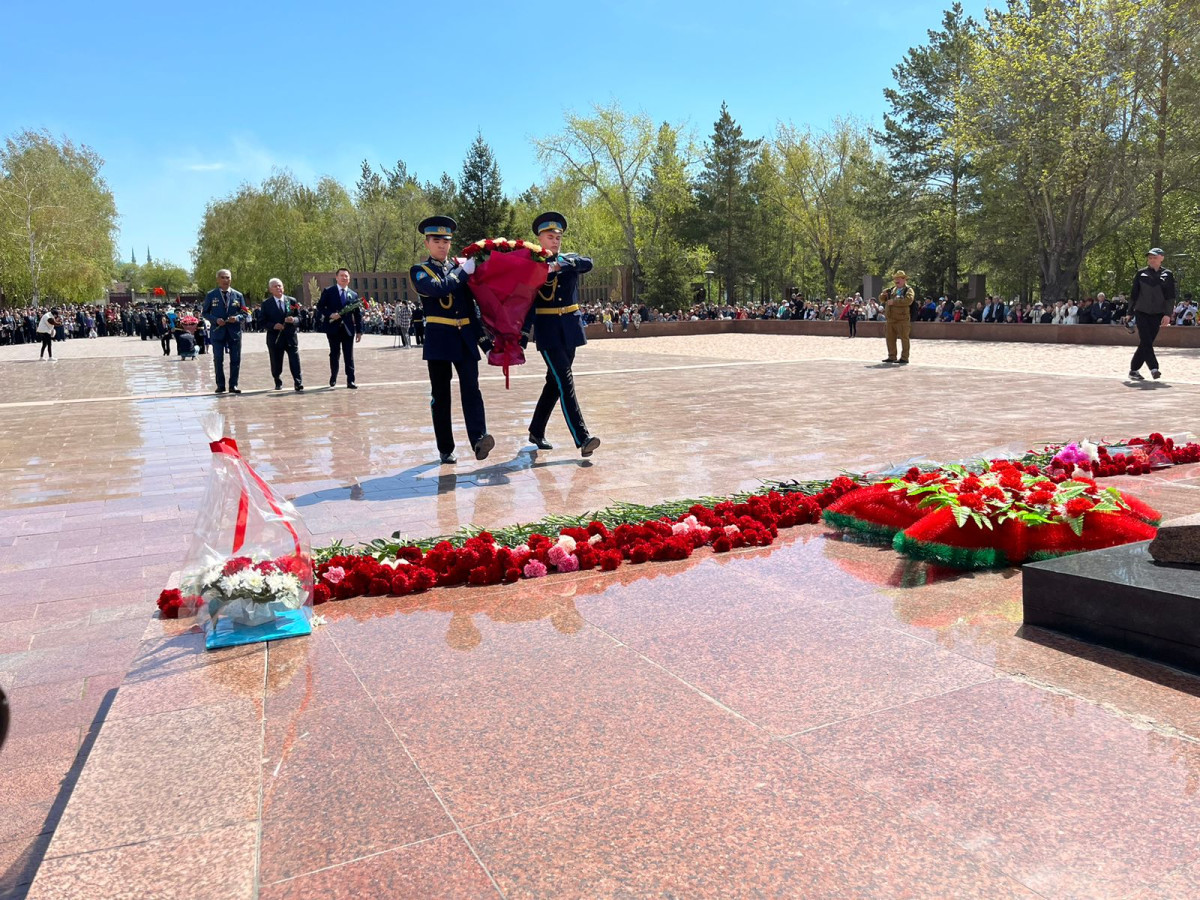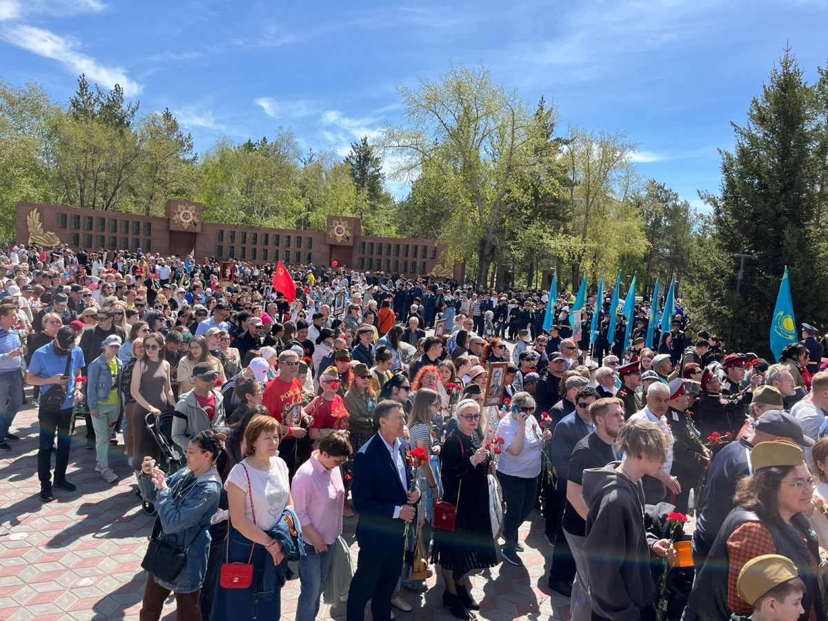 Между тем, сегодня прошло торжественное возложение цветов. У Обелиска славы собрались тысячи павлодарцев с портретами своих дедушек и прадедушек, которые воевали за мирное небо над головой.
