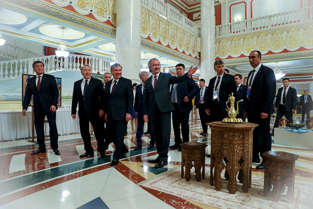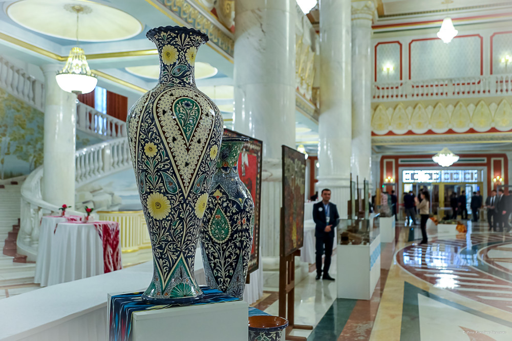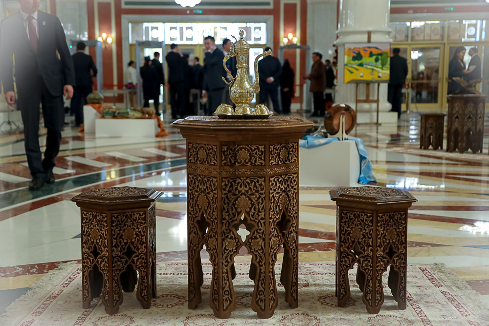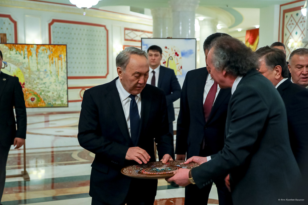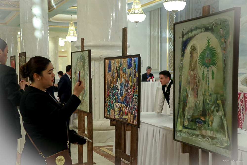 В рамках мероприятия холл театра "Астана Опера" был наполнен шедеврами узбекского творчества. Там развернулась настоящая выставка мастеров искусств Узбекистана, которую посетили главы двух братских государств.