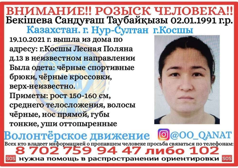 20 октября в 23:11 в отдел полиции Целиноградского района поступило заявление 38-летнего жителя Косшы. Он просил помочь в поиске супруги Бекішовой Сандуғаш Таубайқызы 1991 года рождения.