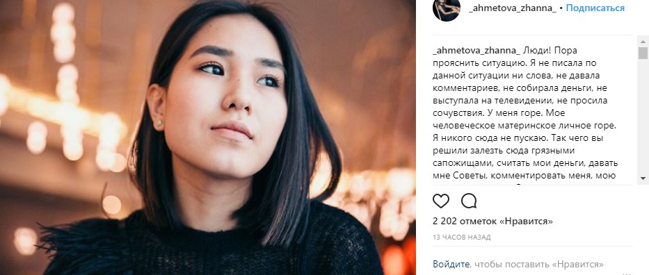 На своей странице Instagram Жанна Ахметова обращается к пользователям сети со слов, что пора прояснить ситуацию. Далее женщина отмечает, что не писала по данной ситуации ни слова, не давала комментариев, не собирала деньги, не выступала на телевидении и не просила сочувствия.