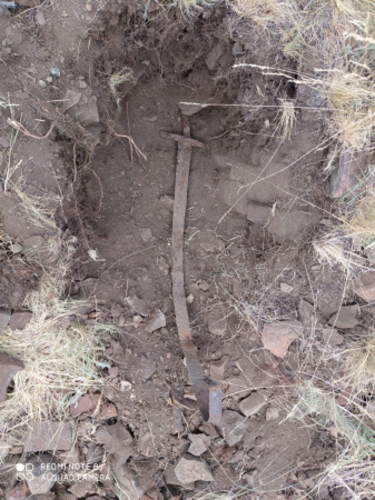 "На обнаруженном кургане на глубине 0,30 метров обнаружен железный меч. Его общая длина – 79 сантиметров, рукояти - 6,5, толщина – 0,4-0,8, ширина – 0,7-2,8 сантиметров. Острие клинка составляет 14 сантиметров, он заточен с двух сторон. На поверхности – умеренный слой ржавчины. Средняя часть и наконечник меча изогнуты. Скорее всего, из-за веса тяжелых камней", - сообщил руководитель центра по охране и использованию историко-культурного наследия Серик Искаков.
