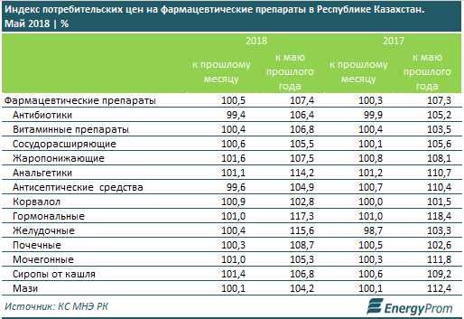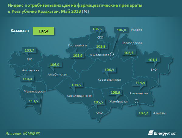 Среди регионов за май сильнее всего ощущался рост цен на лекарства на юге - в Кызылординской (сразу +2,2% к апрелю) и Алматинской (+2,1%) областях.