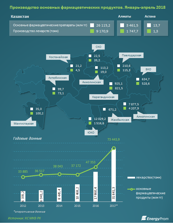 В стоимостном выражении объёмы выпуска основных фармацевтических препаратов составили 26,1 млрд тг за январь-апрель 2018 - это на 2,7% меньше, чем в аналогичном периоде годом ранее.