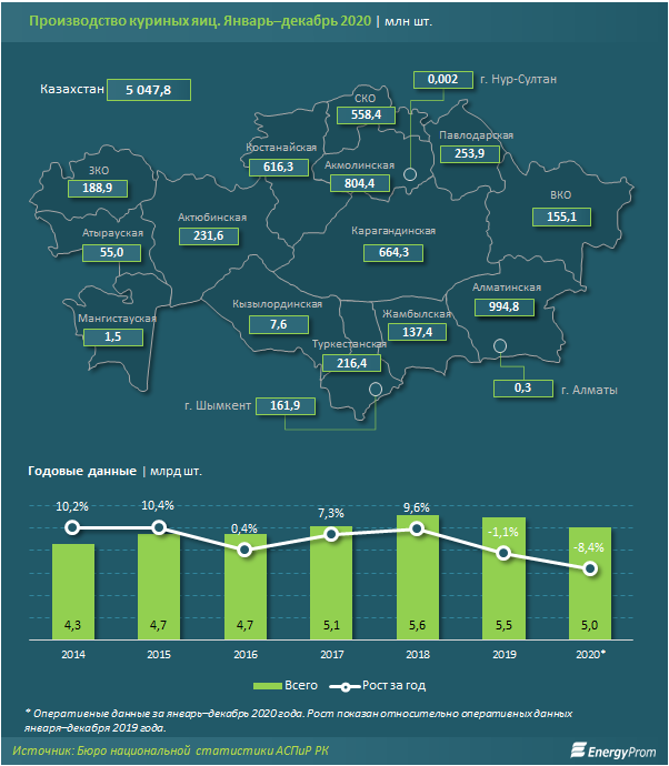 На внутреннем рынке за неполный год реализовали 4,7 миллиарда яиц, годовой рост составил 25,7 процента. За одиннадцать месяцев на каждого жителя страны пришлось в среднем 247,2 яйца. В среднем каждый казахстанец употребляет по два яйца за три дня, то есть менее одного яйца в день.