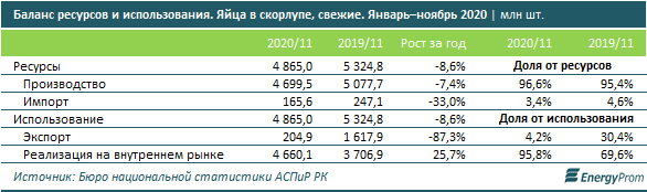 Спрос на яйца (экспорт плюс реализация на внутреннем рынке) по итогам одиннадцати месяцев местные компании обеспечили на 96,6 процента. При этом доля экспорта составила лишь 4,2 процента от имеющихся ресурсов, против 30,4 процента годом ранее. На внешние рынки отправили всего 204,9 миллиона яиц - в 7,9 раза меньше, чем в аналогичном периоде 2019 года.