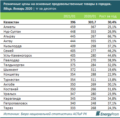 В январе 2021 года на базарах и в магазинах городов страны стоимость десятка яиц составила 396 тенге - сразу на 30,4 процента больше, чем годом ранее, сообщает BaigeNews.kz со ссылкой на EnergyProm. Дороже всего среди крупных городов и мегаполисов РК яйца обходятся жителям Алматы, Нур-Султана и Атырау, дешевле всего - жителям Тараза.