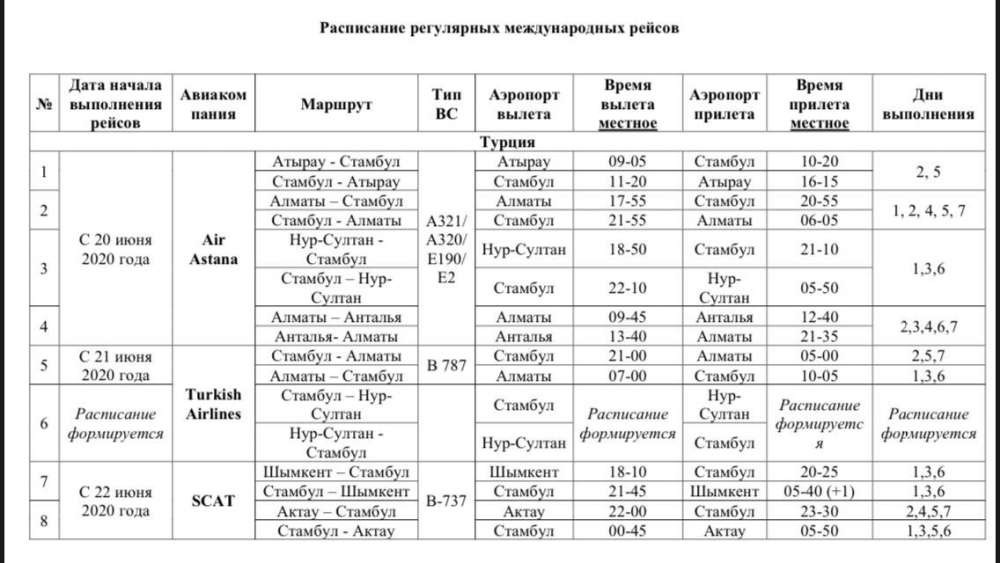 В настоящее время казахстанские и иностранные авиакомпании предварительно сформировали расписание международных рейсов. Авиаперевозки будут выполняться согласно официально опубликованному расписанию на веб-сайтах авиакомпаний. При этом расписание рейсов может корректироваться авиакомпаниями.