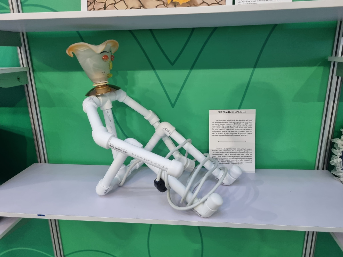 "На эту работу ушло шесть труб, четыре заглушки, четырёхсторонний переходник, четыре полуотвода, трехсторонний переходник, один плафон люстры, два метра провода и одна вилка. Этой работой я хотел показать, что необязательно выбрасывать ненужные вещи. Им можно дать новую жизнь. Зачастую мы этим пренебрегаем. В результате сейчас имеем проблемы с мусором и загрязнённостью", — поделился Нуркелди Жумалы.