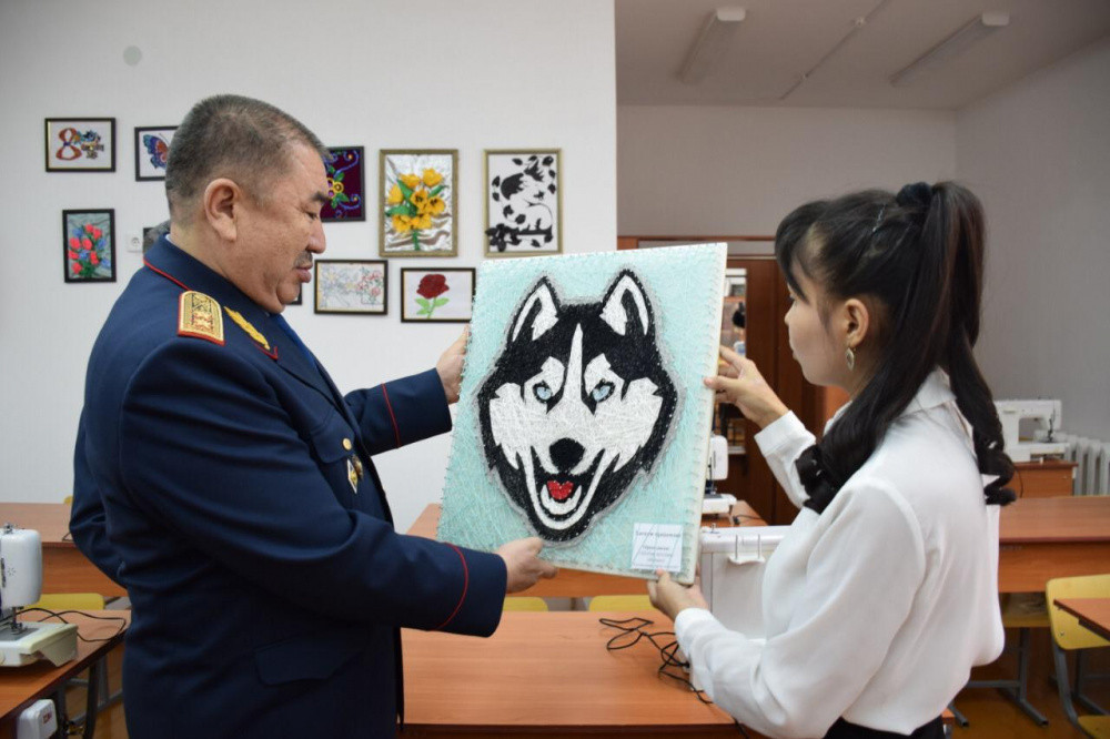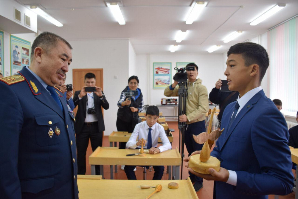 Главе МВД показали кабинеты информатики, труда и технологии, а школьники вручили гостю поделки, сделанные своими руками.