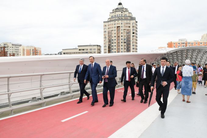 Далее гости прошлись по набережной реки Есиль и по новому пешеходному мосту, который является подарком Атырауской области к юбилею столицы.
